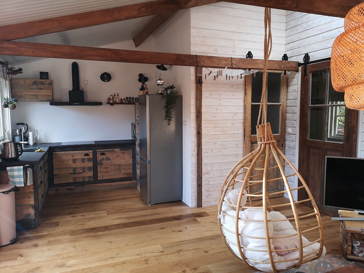 Casa de madera, construida por nosotros mismos en 2020. En gran parte con material reciclado. ¡La casa tiene nada menos que 20 paneles solares! Las vigas y la cumbrera se han dejado a la vista, lo que da un efecto espacial. Una pequeña ventana de la granja donde nació Karin se ha incorporado a la cumbrera. Los viejos ladrillos amarillos de esa granja forman la terraza, junto con las baldosas del sótano. ¡Como sorpresa, el marido de Karin hizo un corazón en la terraza! En general, un buen lugar para quedarse.