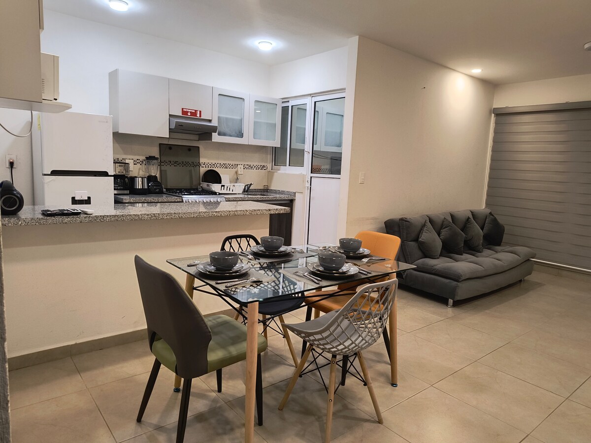 Incredible view in a two-bedroom apartment: access to the lagoon, swimming pool, paddleboarding, fully equipped kitchen, WiFi, living room, dining room, and much more. Our apartment is fully furnished and has an amazing view. If you're looking for a peaceful and pleasant place to spend a great vacation, look no further! You can access the lagoon and enjoy its pools. There's an Oxxo convenience store within the development, just 5 minutes away.