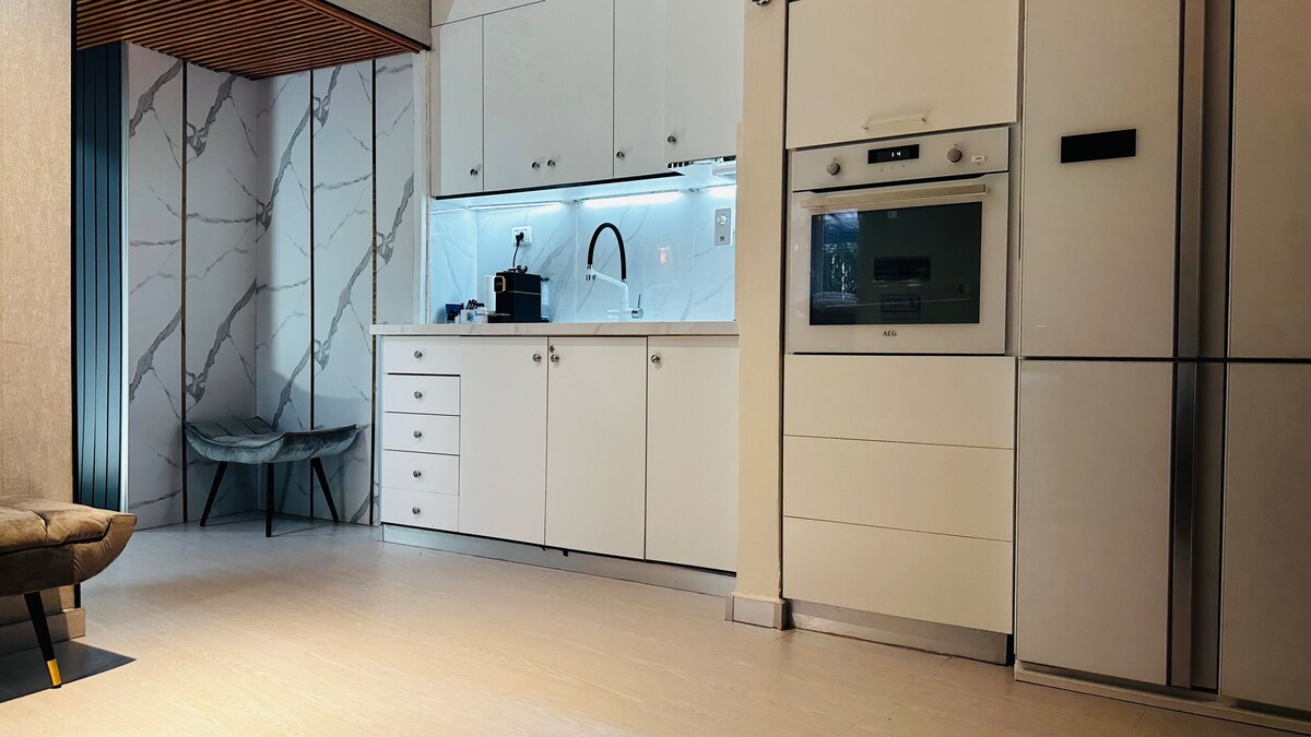 Una suite única con vista al mar abierto, diseñada con un alto nivel, decoración italiana, parquet en toda la suite, un dormitorio doble con vista al mar, otra habitación con una litera que se abre a otra cama individual y un sofá en la sala de estar que se abre a una cama doble, cocina totalmente equipada, nevera, área de bar de café y agua, televisores, wifi, unidad tranquila y acogedora, amueblada y equipada