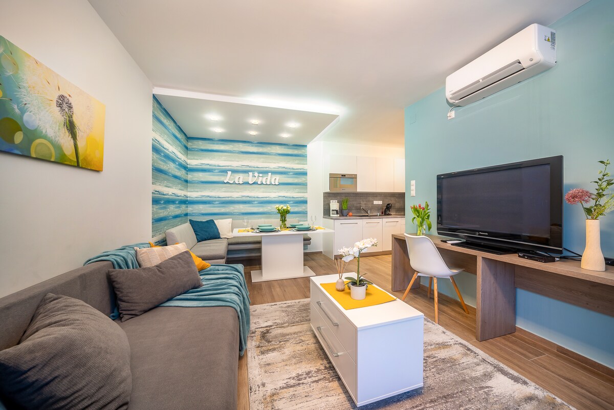 ¿Qué ofrecemos? - 400 metros de la entrada al complejo de spa - ambiente tranquilo y tranquilo - aparcamiento gratuito en un patio cerrado - apartamento para no fumadores - varias opciones de comedor en los alrededores Apartamento con un dormitorio, amplia sala de estar, baño, cocina bien equipada (hervidor, cafetera, microondas, nevera, congelador, tostadora, placa), pasillo y balcón con 2 televisores LCD, aire acondicionado y acceso WIFI.
