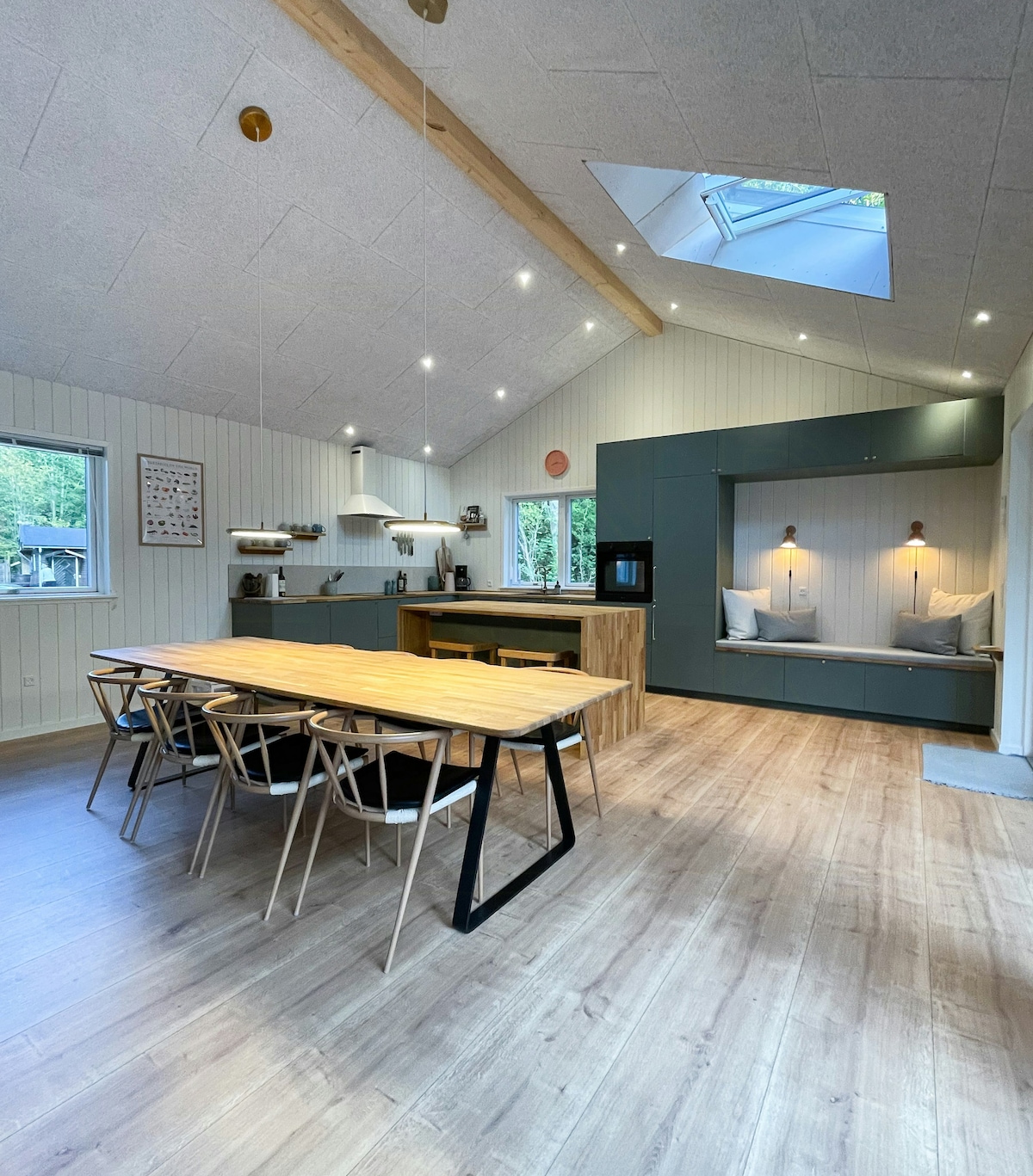 El bosque como vecino y vistas a los campos. El refugio perfecto lejos del ruido y de nosotros, cerca de la playa y de las actividades. Hay 4 dormitorios y un amplio altillo. Hay un baño grande, así como un aseo al que se accede desde el exterior, con una ducha al aire libre. La cocina es una cocina de carpintería con electrodomésticos Miele. Sumérjase en el baño silvestre y disfrute de un paseo en la sauna. La casa tiene un total de 5 altavoces inalámbricos. En la esquina del jardín hay una zona de fogatas con un columpio donde toda la familia puede hacer pan sobre el fuego.
