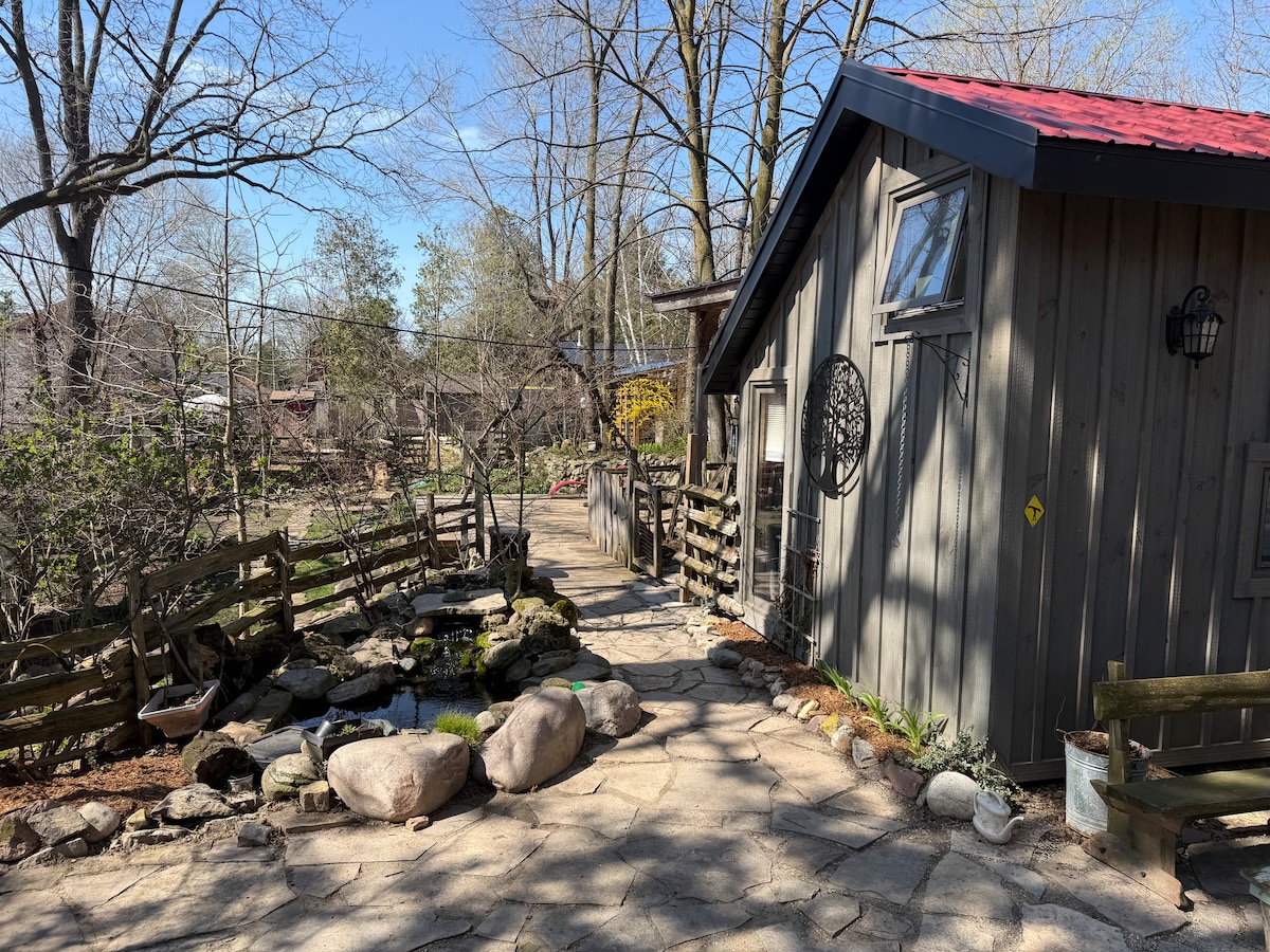 Take it easy at this unique cabin experience in the city. The Tiny House is a private 9’ x 12’, fully insulated, 4 season cabin with a couch, kitchenette with running water, queen bed, Loftnet hammock & outdoor shower. Enjoy the natural beauty of our half acre tree-filled backyard, yet still close to downtown Guelph. This is a glamping experience that requires appreciation for tiny house living. Guests have access to a separate portable washroom, by walking about 100ft to the back of the yard.