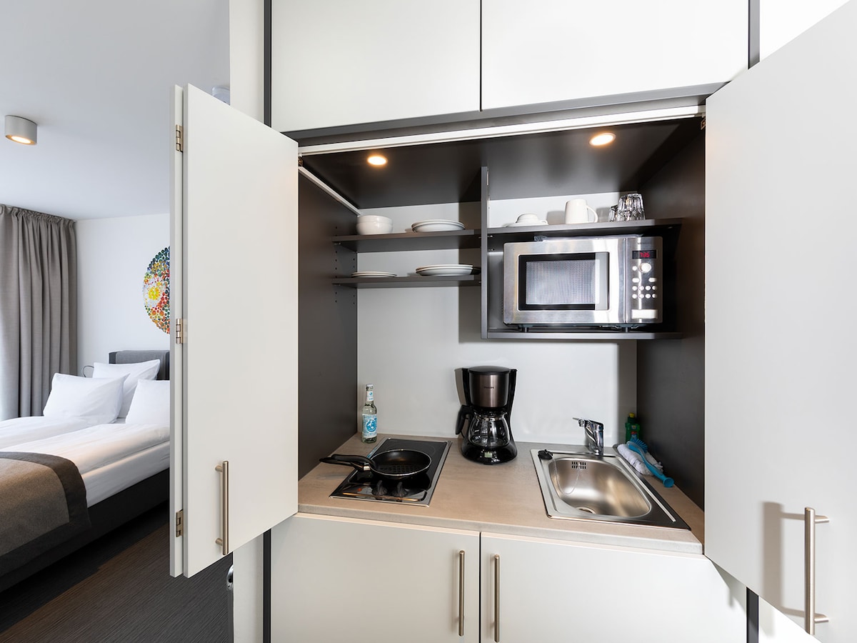 - Estudio con 30 m² / 323 pies cuadrados de espacio - Ideal para un máximo de 2 personas - Cama doble (160x200 cm / 63x79in) - Cuarto de baño moderno con ducha - Cocina pequeña totalmente equipada con artículos básicos para hacer té y café y una mesa de comedor. Ten en cuenta que la habitación real puede diferir de las fotos.