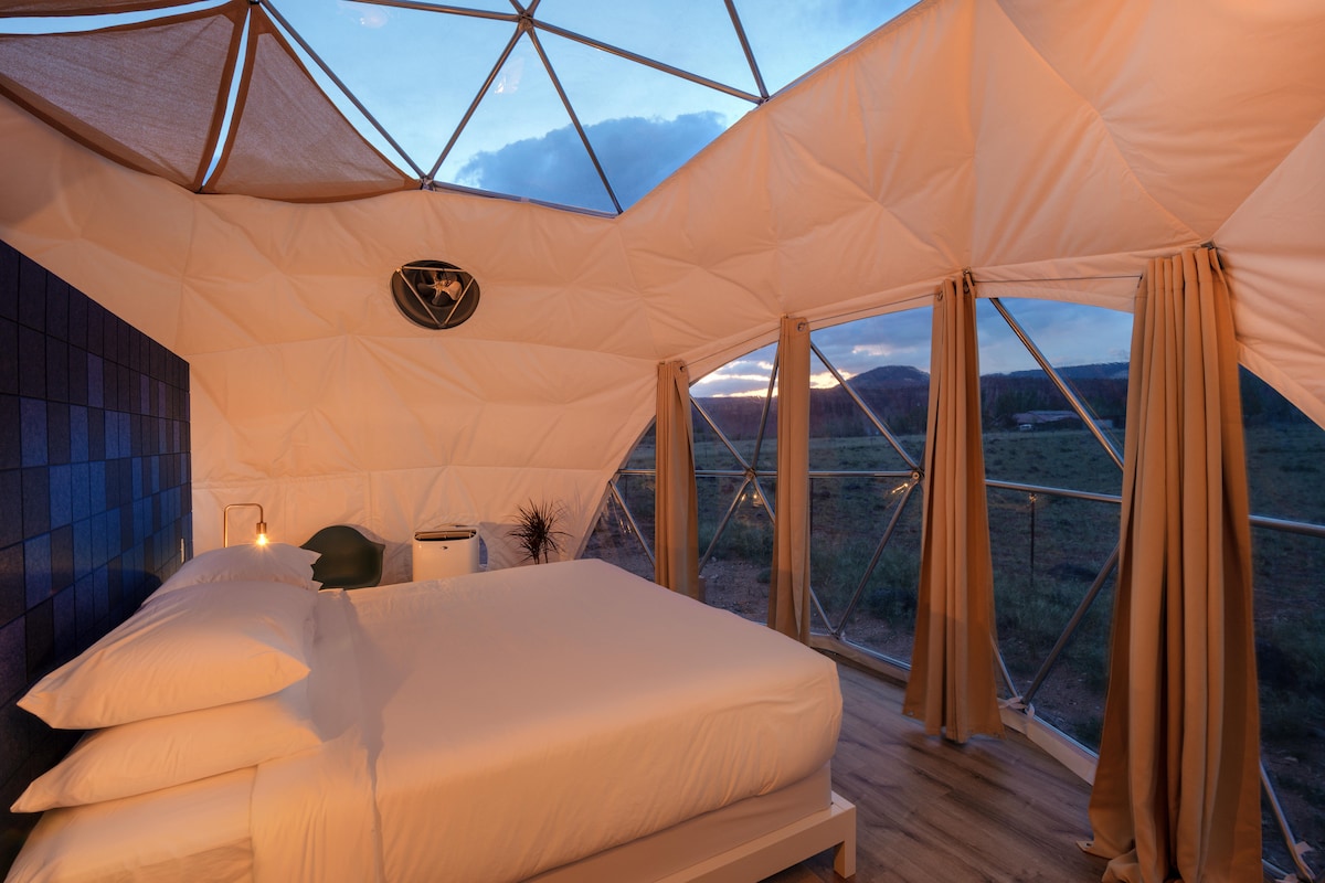 Nuestro Glamping King Skylight Dome en Skyview Hotel ofrece una experiencia de campamento elevada con todas las comodidades modernas. Relájate y disfruta de la sensación de dormir bajo las estrellas con un tragaluz situado directamente sobre la cama tamaño king. Relájate con nuestros modernos asientos de salón y disfruta de las vistas desde la chimenea ubicada en el centro (los S'mores corren de nuestra cuenta). Disfruta de ropa de cama y toallas de lujo, delicias de cortesía de origen local y tu propio baño privado ubicado en el centro, a unos 45 metros de distancia.