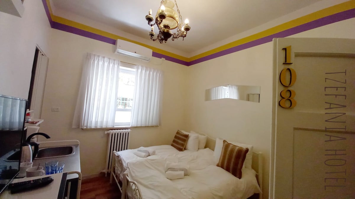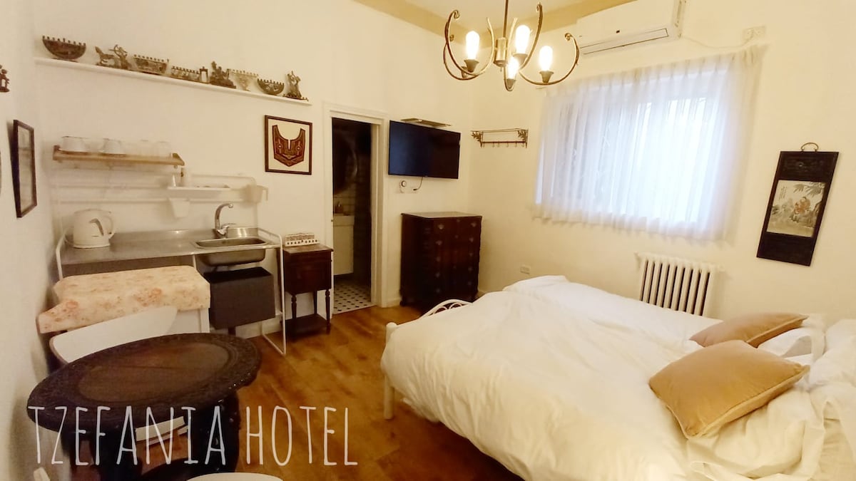 Bienvenido al Hotel Tzefania :) El Tzefania Hotel es uno de los primeros hoteles de Jerusalén Ofrecemos 18 habitaciones renovadas, cada una diseñada de manera diferente; todas las habitaciones están renovadas con muebles del siglo XIX y una lámpara de araña en el centro de la habitación. El objetivo es que cuando el huésped entre en el hotel, sienta la Jerusalén original combinada con la nueva, la auténtica y la conservadora, donde cualquiera se sentirá como en casa. El hotel está situado en el barrio de Geula, Jerusalén.