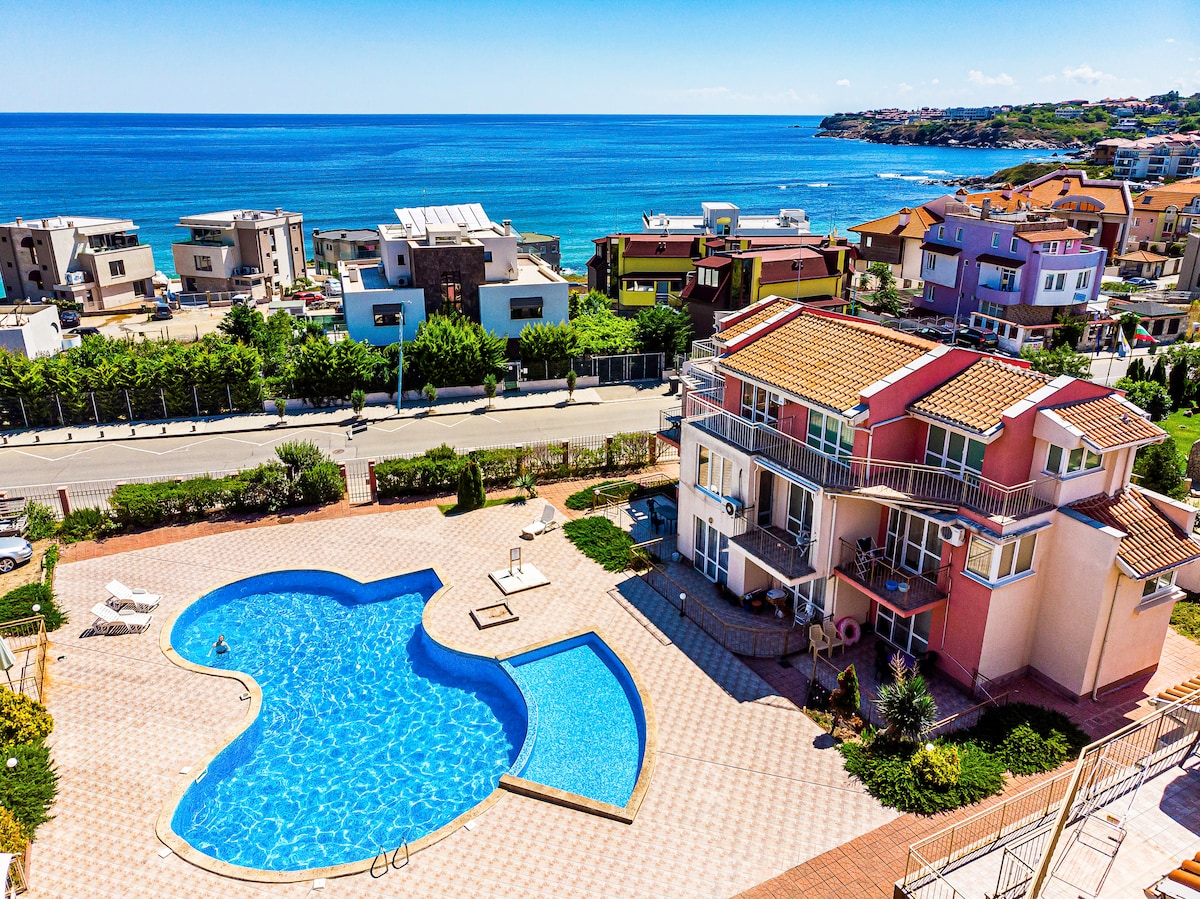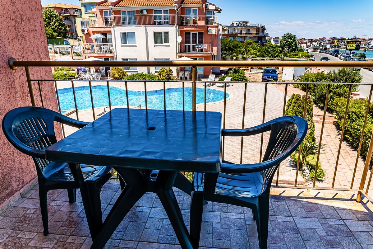 Hola, los apartamentos están ubicados en una comunidad cerrada con piscina privada, su propio espacio de estacionamiento y seguridad. La ubicación se encuentra en un lugar tranquilo y apacible y al mismo tiempo a 100 metros de la playa "Harmani". Tienes vista a la piscina y a la ciudad de Sozopol. A 2/3 minutos a pie de la famosa "calle alegre", que alberga numerosos restaurantes y tiendas y a 15 minutos del casco antiguo.