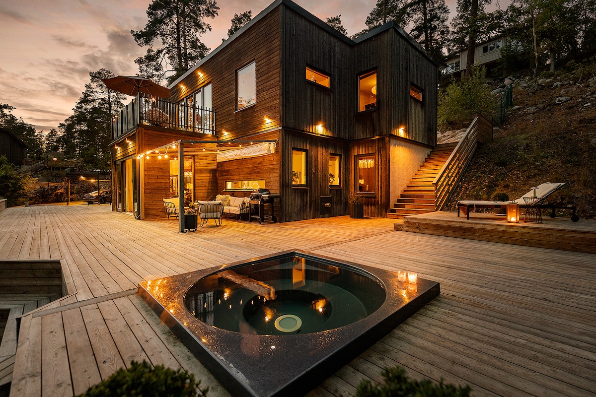 Casa junto al mar en un embarcadero👍Disfruta del jacuzzi y la sauna de leña. Fantástico entorno al aire libre. Casa moderna y totalmente equipada, decorada con buen gusto. Experiencia perfecta para aquellos que quieren pasar un rato relajante y hermoso en el agua🌞 Si quieres estar activo: canoa, camina por el parque nacional cercano, corre o ve en barco. ¡Todo esto a solo 30 minutos de Estocolmo! Imagina pasar unos días o semanas en este entorno 😀 - Todo el espacio está disponible de forma privada para ustedes como huéspedes.