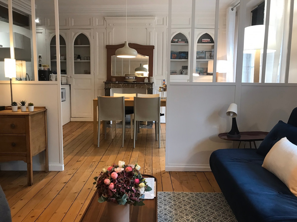 Impresionante apartamento de 50 m2 con cocina abierta a la sala de estar con sus grandes armarios moldeados, dosel, 2 chimeneas decorativas, una de mármol rosa y su parquet auténtico. Equipado con todas las comodidades con sillas de playa y sombrilla😎. Blanco Tiza donde el lugar ideal entre la playa y la ciudad para pasar un momento inolvidable: a una calle del paseo marítimo y de los Baños: el famoso centro de talasoterapia con su piscina exterior con agua de mar climatizada durante todo el año.