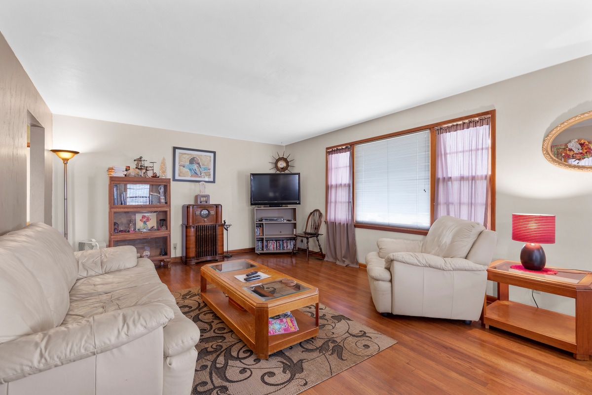 Hermosa casa de 2 dormitorios con cama tamaño queen en cada una, sala de estar, cocina, artículos de primera necesidad, lavavajillas, lavadora y secadora, aire acondicionado, porche delantero, patio trasero y entrada grande. Los viajeros recibirán un código para entrar. Incluye wifi, puerto de carga USB, escritorio y silla. Se proporciona café y té. Sírvete cualquier tentempié. Hay cartas, juegos y libros para pasar el tiempo. Cable de espectro en roku TV. A minutos del centro de la ciudad, Midland, 31 West, Denison Univ, National Trails, Babe Ruth y golf.