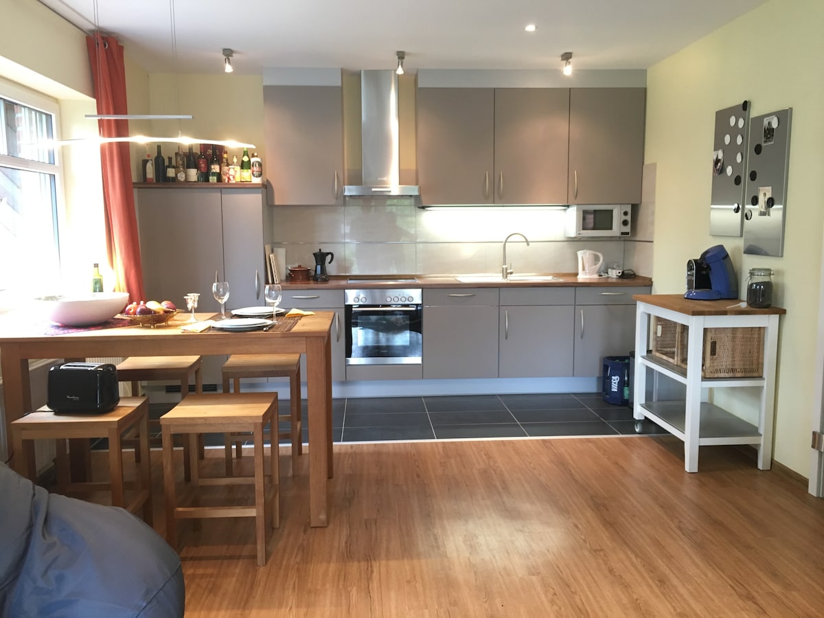 El acogedor apartamento de vacaciones ofrece en aprox. 42 metros cuadrados, todo lo necesario para una para una estancia agradable: - cocina totalmente equipada con lavadora-secadora - dormitorio separado con cama de 180 cm - sofá cama con una gran superficie amplia (170 x 200 cm) - moderno cuarto de baño con ducha - Aire acondicionado - entrada privada - Aparcamiento propio justo al lado de la entrada - terraza privada en el exterior