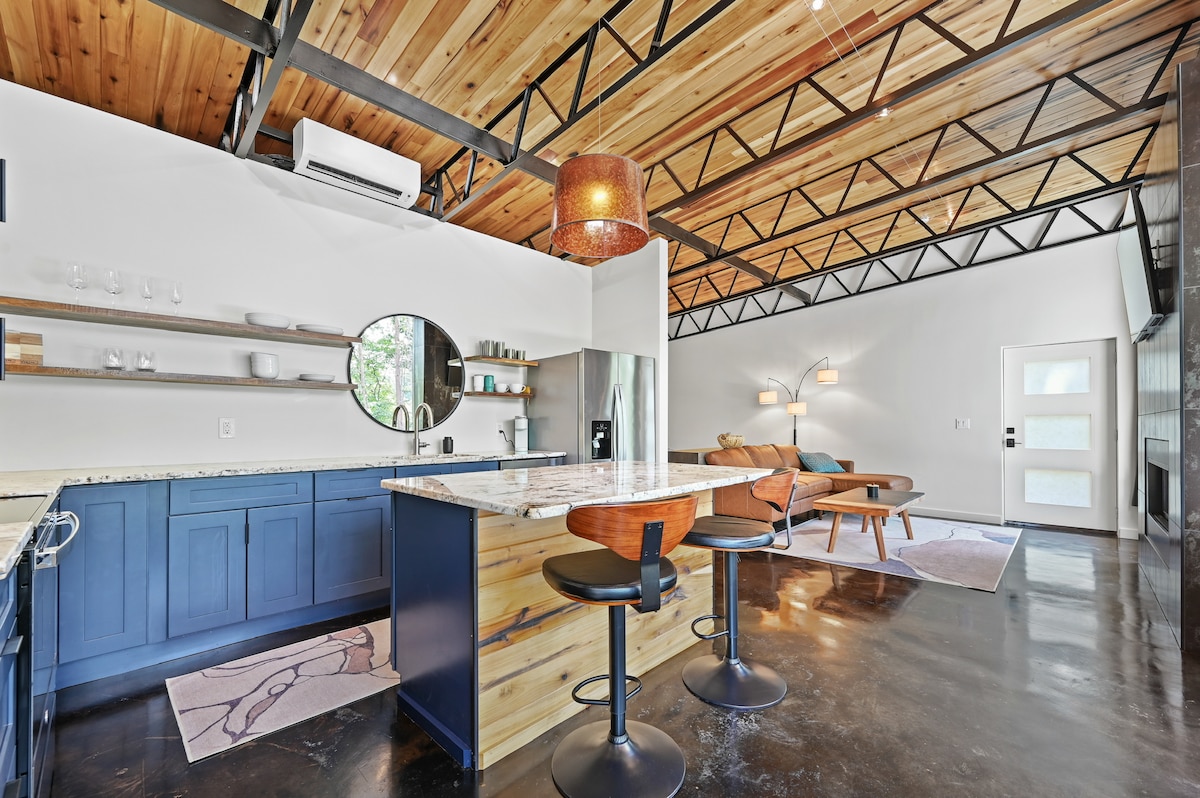 Escápate a Ellerslie Cottage, un refugio tranquilo y rodeado de árboles, encaramado en lo alto del bosque con impresionantes vistas a la montaña y la máxima relajación. Construida recientemente con un hermoso ambiente rústico-moderno, esta encantadora cabaña de 2 dormitorios y 2,5 baños ofrece todas las comodidades del hogar en medio de las serenas montañas Blue Ridge. Sube a la terraza cubierta para una inmersión total en el bosque, perfecta para el café de la mañana o los cócteles de la noche. A solo 3,5 millas del histórico Hendersonville y a minutos del Bosque Estatal Dupont.