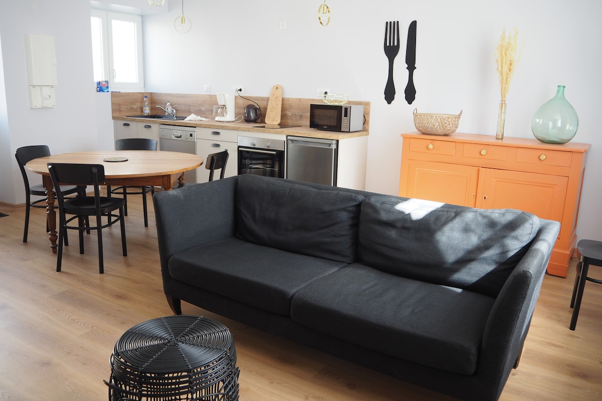 T2 ★ Gran champán ★ de 55 m2 con terraza en el centro, wifi, con ropa de cama, sábanas, jabones y toallas Situado en pleno centro de Cognac a pocos metros de la plaza Francisco I y cerca de todos los comercios. El alojamiento situado en el 2º piso consta de un dormitorio independiente con una cama de 160 cm y una sala de estar totalmente equipada. Cuenta con 2 televisores (dormitorio + sala de estar), así como WIFI gratuito.
