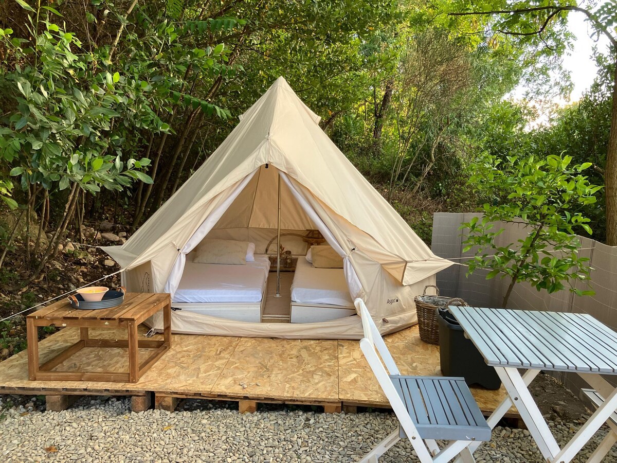 Oculta en un valle forestal en el Parque Natural de los Grandes Causses, al sur de Francia, se encuentra nuestra aldea completamente aislada, Lorre. The Glade es un glade de bosque completamente privado, situado encima de la aldea, con una tienda de campaña de 5 metros bellamente equipada. La aldea en sí se encuentra en 80 acres de bosque privado y rodeada de naturaleza; con una piscina con vistas a los árboles, una bañera de hidromasaje alimentada por leña, un bosque serpenteante y paseos junto al arroyo y vistas increíbles. Es idílico.