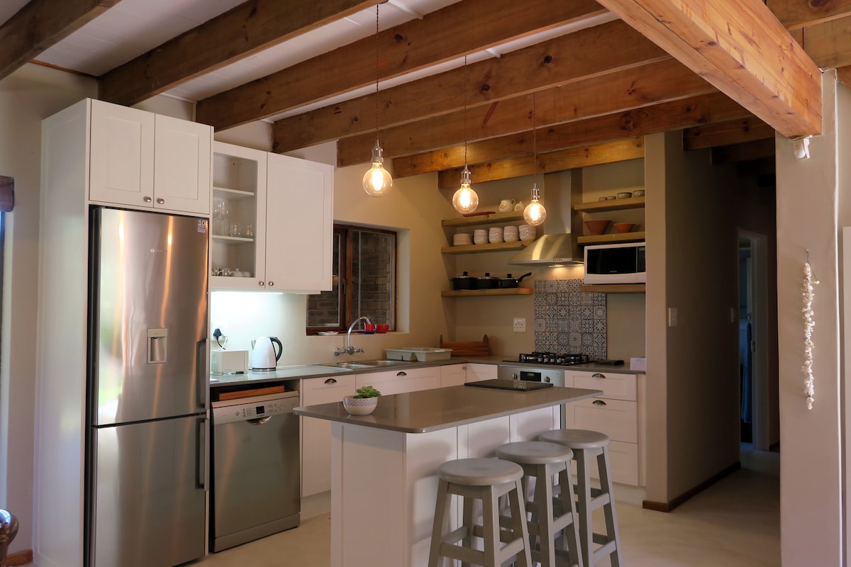 Bienvenido a nuestra encantadora casa de campo con los sonidos del pequeño río, las ranas y el océano de fondo. Betty's Bay es muy conocida por su naturaleza virgen, montaña, fynbos, playas, lagos y magníficos pingüinos africanos (burros). Los pingüinos están a poca distancia a pie. El famoso jardín botánico Harold Porter está a 5 minutos en coche. Betty's Bay tiene infinitas oportunidades para practicar senderismo, surf, pesca con caña y esnórquel. A unos 700 metros de la casa hay una tienda de comestibles local.