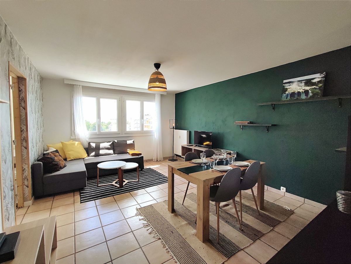 Apartamento familiar o con amigos para 8 le da la bienvenida a Hérouville-Saint-Clair, a 4 km de la estación de tren de Caen. El aeropuerto más cercano (Aeropuerto de Caen-Carpiquet) está a 11 km. El apartamento: - Cuatro habitaciones con cama de matrimonio. - Una cálida sala de estar con un sofá y un televisor. - Una estancia para almorzar/trabajar. - Una cocina bien equipada donde se puede cocinar. - Un cuarto de baño. Incluye: Wifi, toallas (1 por persona) y sábanas, esponja, paño de cocina y dosis de café.