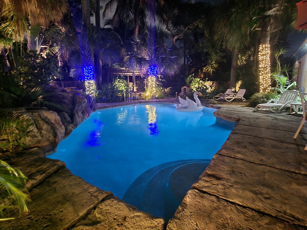 - Piscina CLIMATIZADA GIGANTE con flotadores y comodidades para todos. - JACUZZI perfecto para una noche fría. - BARRIL DE HIELO 400 para recuperarse y refrescarse. - Putting Green - FOGATA para relajarse - Hamaca para dormir la siesta bajo el sol - N64 para 4 jugadores. - Cafetería - Tocadiscos - Cargador para vehículos eléctricos/Tesla, 48 W - ¡Parrilla de propano y cocina totalmente abastecida! - ¡A 7 minutos en coche de la playa! - Se adapta fácilmente a 6 adultos y 4 niños. ¡Ahora tienes la oportunidad de reservar la escapada perfecta para cualquier grupo que busque lo mejor de Fort Lauderdale!