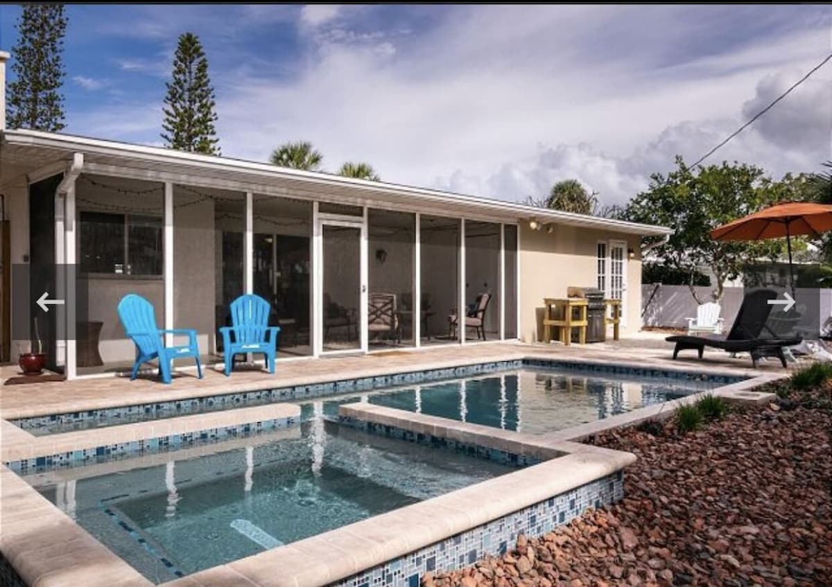 Twin Palms es el hogar de la escritora y chef gastronómica más vendida del NY Times y su esposo tecnológico. Se admiten bebés/niños/mascotas a solo 5 minutos a pie de playa. Piscina privada de estilo laguna *climatizada* de agua salada/bajo cloro en medio de un exuberante paisaje con una hermosa cascada de roca. Electrodomésticos nuevos, climatización, TV Sony de alta definición de 60 pulgadas, sofás reclinables de cuero italiano, barbacoa, equipo de playa, tres dormitorios tamaño king, todas las sábanas incluidas. Casa clásica de un nivel de Florida, sin escaleras. Administrado directamente por los propietarios, así que no hay tarifas locas.