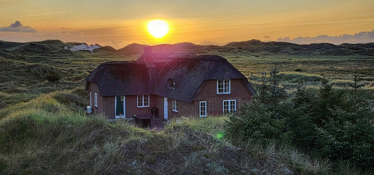 Dette skønne, stråtægte hus ligger helt ugeneret i læ bag klitten lige ud til Vesterhavet og har en vidunderlig udsigt over ådalen og dens rige dyreliv. Her er en helt særlig atmosfære og huset er skønt uanset om I vil hygge jer med familie og venner, kommer for at nyde roen og det vidunderlige landskab eller vil sidde koncentreret med noget arbejde. Der kan altid findes læ lige omkring huset, hvor solen er fra den står op, til aftenen falder på. I kan gå ned at bade på få minutter.
