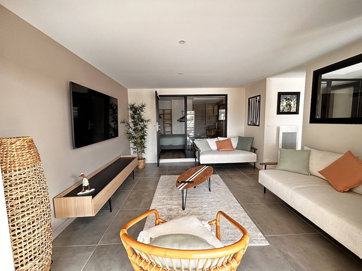 El apartamento de 60 m2 se encuentra en el corazón del pueblo de Seignosse, en la tranquilidad de un callejón sin salida. Todas las comodidades se encuentran en las inmediaciones (panadería, tienda de comestibles, peluquería, etc.). Una vez en el apartamento, le seducirá la luminosidad y la tranquilidad del lugar. El salón da a un estanque privado cuyos colores cambian a lo largo de las horas del día. La terraza protegida de 13 m2 le permitirá disfrutar de este entorno idílico alrededor de una comida, un desayuno... o un aperitivo.