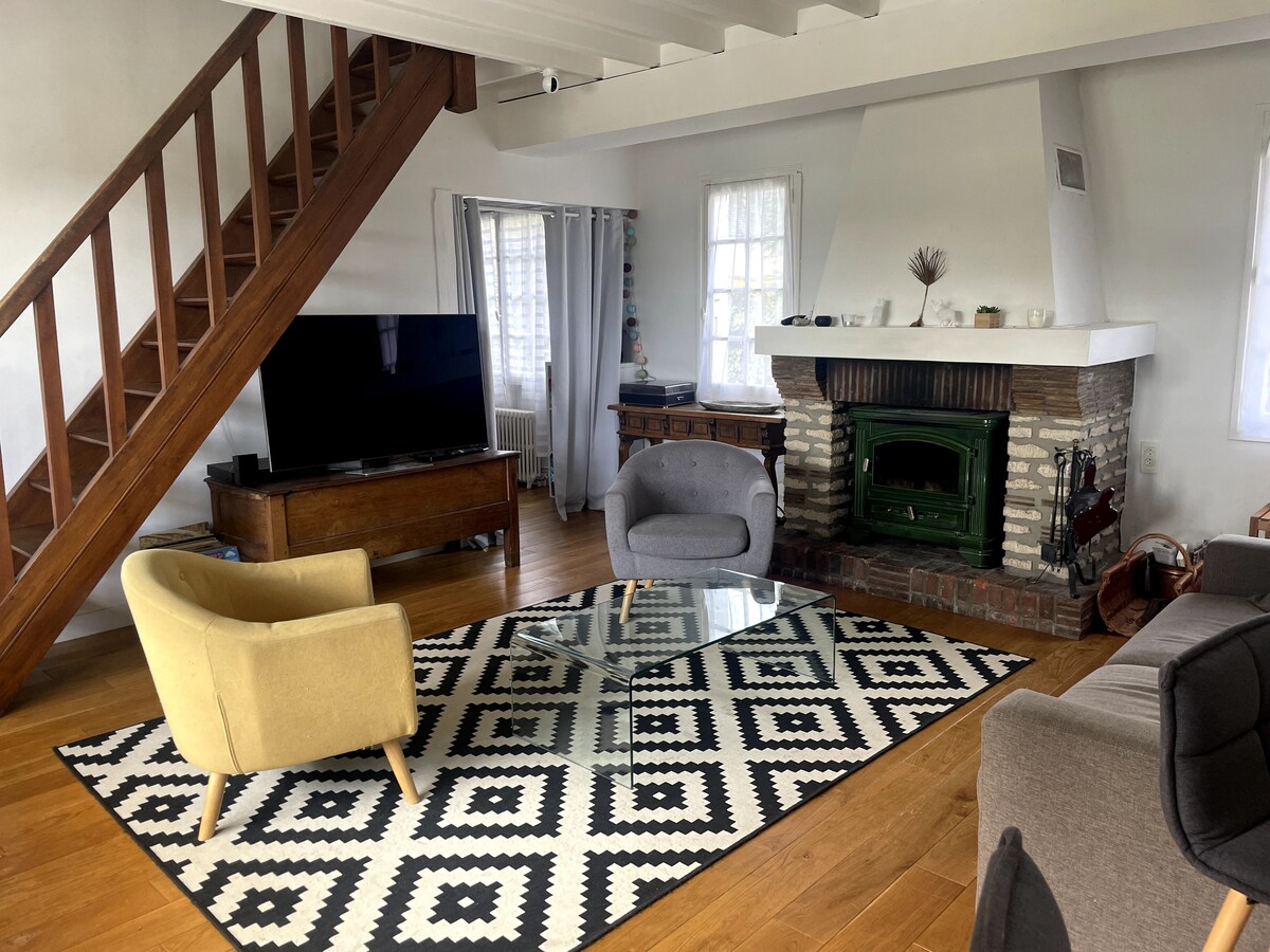 Casa de 200 m2 en las alturas del valle del Eure a 80 km de París, a 20 km de Giverny. Gran jardín no cerrado, terraza en césped con vistas al valle Ideal para reuniones familiares o con amigos Rodeada de bosques y campos En la planta baja: 2 dormitorios, uno de ellos muy grande, un baño, un aseo, y un gran salón de 50 m2 con chimenea, cocina abierta. Veranda comedor de 18m2 Arriba: 3 dormitorios, uno de ellos muy pequeño, un baño con inodoro con inodoro.
