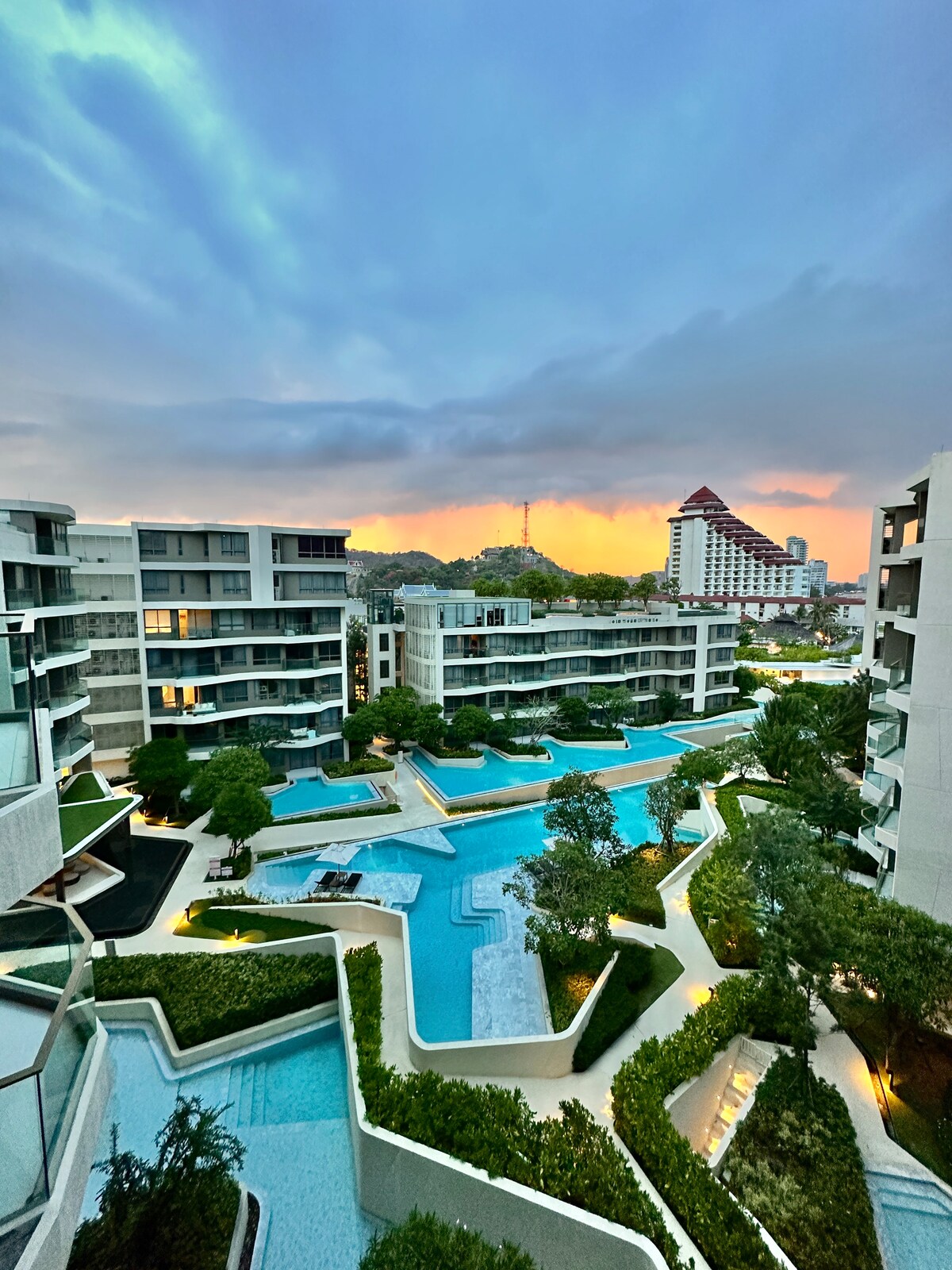 Relájate con toda la familia en este lugar tranquilo con 2 piscinas grandes y control deslizante. Una hermosa gran piscina junto a la playa aislada con una espectacular puesta de sol. El apartamento de un dormitorio de 89 metros cuadrados con 1 cama tamaño king y 1 cama tamaño queen. un sofá en forma de L, un sofá cama, una despensa pequeña con mesa de comedor, nevera, microondas, aire acondicionado, armario, wifi gratuito, televisión. Mucho espacio para estacionar. Lugar tranquilo, bueno para un viaje familiar o en pareja. A pocos pasos de la playa de Hua-Hin.