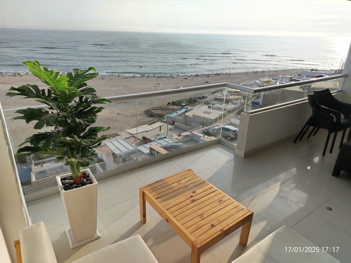 Departamento de nuevo con vista al mar, a 5 cuadras de la playa. Cuenta con 2 piscinas , área de parrillas , cancha de fútbol , básquet juegos para niños e ingresos para personas con discapacidad , si buscas celebrar tu cumpleaños , una escapada romántica, o estar con la familia este es tu lugar, disfruta del nuevo mall Punta Mar a solo 5 minutos y el centro comercial KM 40 con variedad de tiendas como Wong y el Gimnasio Smart Fit , además de variedad de discotecas.