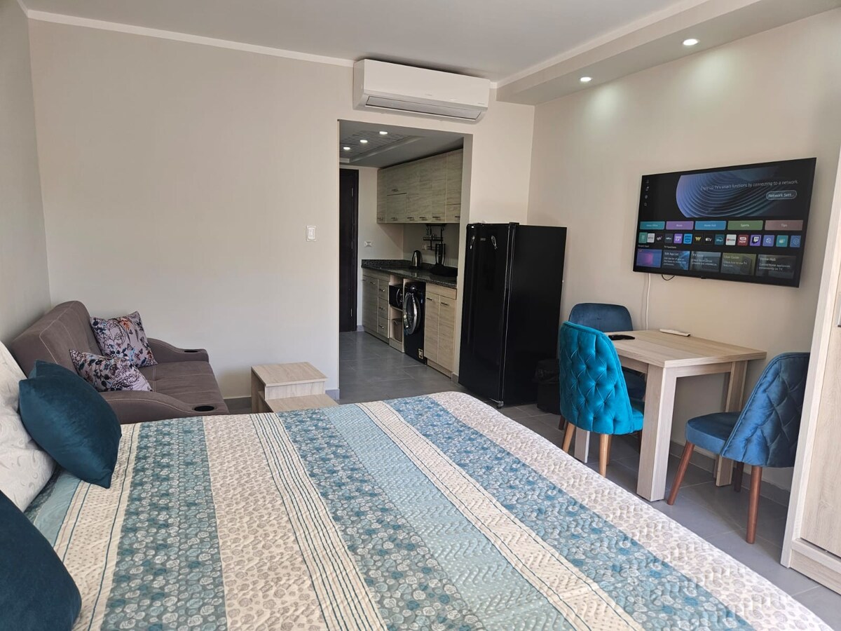 Maravilloso apartamento en el distrito intercontinental de Hurghada. El dormitorio está equipado con una cama tamaño queen, cocina abierta,sala de estar con sofá cama y mesa de comedor. Puedes llegar a la azotea privada a través de tu propia escalera, que es invisible. Hay tumbonas,sofá salón y una mesa de comedor disponible. En la casa hay una piscina a tu disposición. A 15 minutos del aeropuerto, a 5 minutos a pie de la playa de Mamsha +. Restaurantes,farmacia y supermercado en las inmediaciones