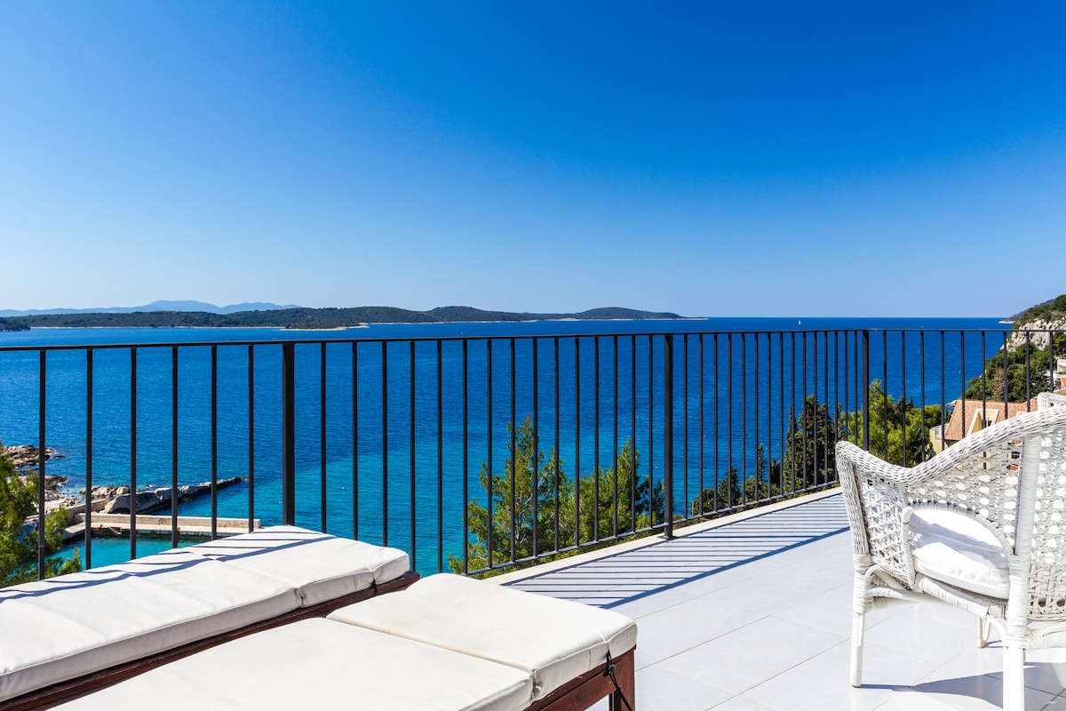 A bright and airy apartment in Hvar, with a large terrace opening to a view of the Adriatic sea. The apartment was recently refurbished and features a modern, elegant decor with a Mediterranean vibe.