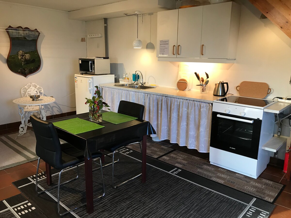 Nuevo apartamento renovado con colores brillantes situado cerca de zonas pintorescas. A solo 1 minuto del servicio gratuito de autobús a todo Tórshavn. El apartamento tiene su propia entrada y tiene 56 m2 con un dormitorio, un baño y cocina y sala de estar en uno. El dormitorio tiene una cama doble (140 cm) y una cuna de viaje para niños pequeños si lo deseas. La sala de estar tiene un sofá cama donde dos personas pueden dormir. Wifi gratuito y nuevo Smart TV. Estacionamiento gratuito justo afuera.