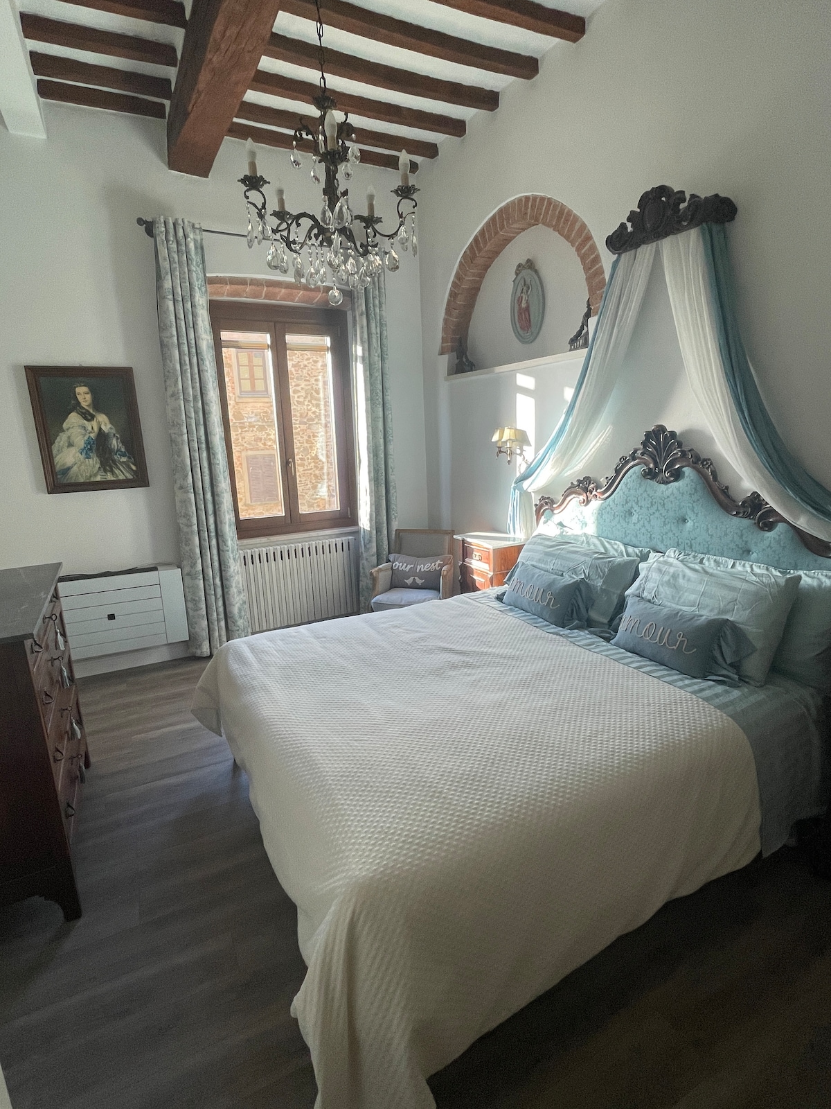 Immagina di svegliarti con le colline ornate di borghi e campanili a perdita d'occhio oltre la finestra della camera da letto: un'alcova con soffitti spioventi, travi e travicelli, pavimento in legno, in cima ad un antico casolare. Immagina da ogni affaccio della casa il sole che splende sulle vigne, oppure immagina il verde acceso degli uliveti dopo la pioggia primaverile oltre la grande terrazza adiacente alla cucina.
