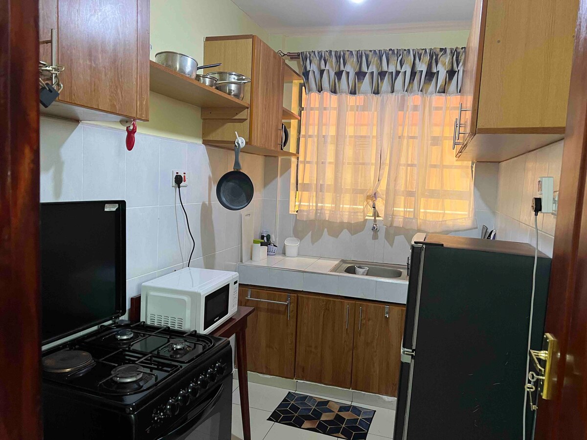 Relax in our peaceful 1BR apartment within a secure, gated community. Everything for a comfortable stay is on-site! Mosquito proofed windows that let in fresh air and keep insects and bugs out! Also enjoy an Instant hot water shower😌 Ultimate Convenience: Minimart, restaurants, salon/spa steps from your door. Prime Location: Quick 20-min drive to JKIA and 10 min to Crystal Rivers Mall. Bonus: Ample parking and a quiet, family-friendly neighborhood. Experience the perfect, stress-free stay!