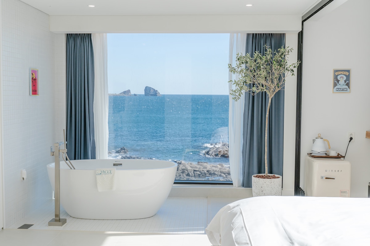 Me encanta el amplio mar de Jeju y Gotjawal, el corazón de Jeju. Espero que este hermoso lugar, Jeju, se mantenga como un lugar donde la naturaleza vive y respira. Por eso, nos esforzamos por ser un hotel que tenga el mínimo impacto en el ecosistema y la naturaleza de Jeju. La misión y filosofía de Tropical Hideaway es proteger Jeju, y hacer que la gente se una a nosotros de una manera divertida y fácil. Y queremos ser una plataforma de cambio. Hoy también nos esforzaremos para que sea parte de un maravilloso viaje a Jeju. Es un alojamiento con un diseño interior que destaca.