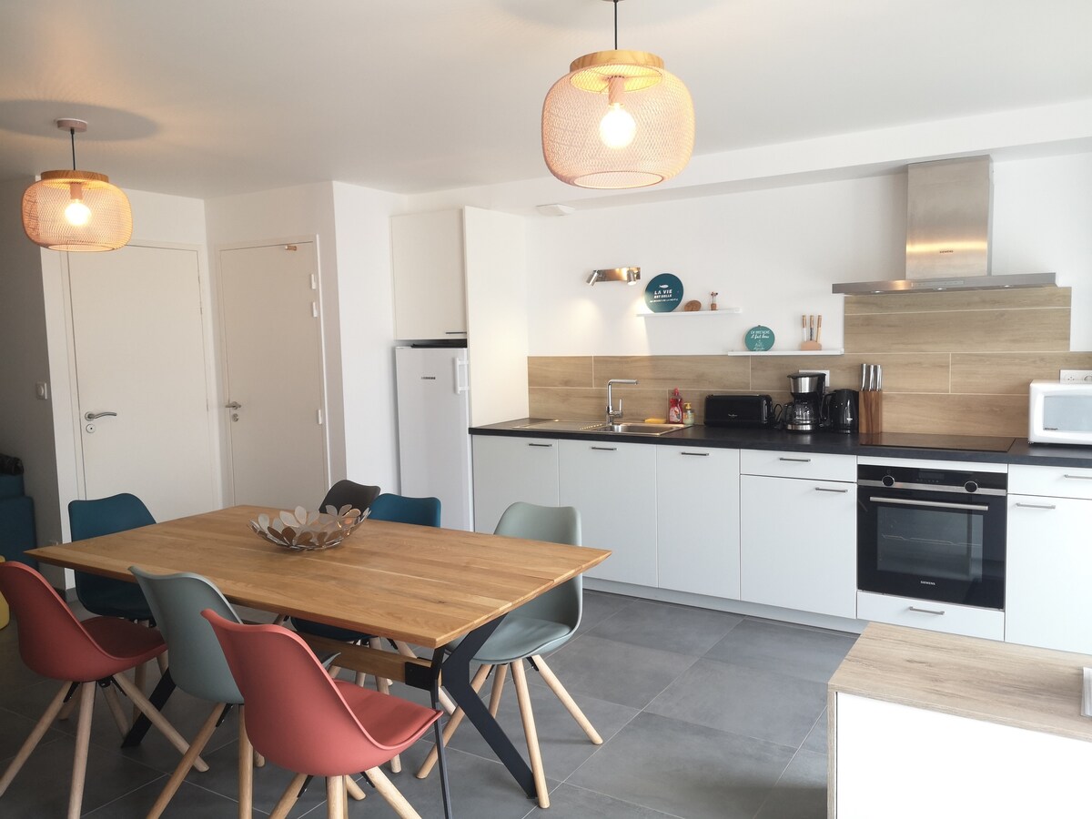El apartamento «Côté Dune» es un verdadero refugio junto al mar. El salón y la zona de cocina (muy bien equipada) dan a la terraza. El dormitorio ofrece una cama tamaño king de calidad. El baño está equipado con una bañera. El inodoro es independiente. Ropa de cama y de baño de calidad. ¡Todo está hecho para tu comodidad! Amigos ingleses: está a 2 horas en coche del barco a Roscoff o a 1 hora en coche del aeropuerto de Brest y su servicio Brest-Londres