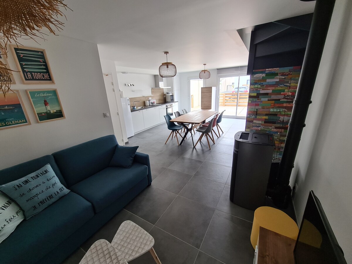 Maison de 2021, classée meublé de tourisme 3 étoiles, située au centre de l'île Tudy, à 150m de la plage et du port. A proximité de Pont l'abbé, Loctudy et Bénodet, vous pourrez profiter de belles promenades à pied, à vélo et en bateau! Activités nautiques à proximité pour petits et grands: surf, paddle... Vasière pour la pêche à pied à 50m. Au calme, c'est le cadre idéal pour des vacances dépaysantes, proche de toutes les commodités (Restaurants, épicerie...) à 5min à pied.