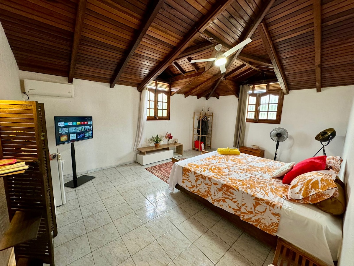 Olvídese de sus preocupaciones en este espacioso alojamiento. Podrá disfrutar de la tranquilidad, la exuberante vegetación tropical y de la piscina (climatizada si es necesario) con bicicleta acuática y del cenador, equipado con una barbacoa y una plancha. Kaz a GG se encuentra al pie de la Soufrière a 10 minutos de la playa de Rivière Sens. Podrá desayunar en medio de los árboles, cerca del estanque de peces, acunado por el sonido del agua y el canto de los pájaros. Pequeños comercios a menos de 10 minutos a pie.