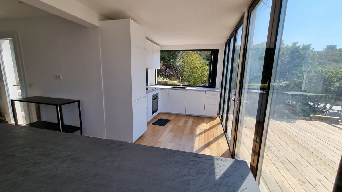 You will be our only guests in our heaven of peace! You have the option of renting either our luxurious 33 m2 (353 sq2) studio, equipped for two people, or this same studio plus an extra room, for four people maximum (60 m2- 642 sq2 total) You would benefit from a 86 m2 (920 sq2) private terrace with a 180° panoramic breath-taking view on the Mediterranean and the Îles d’Or, as well as an amazing pool reserved only for our guests, overlooking the villa, with an equally incredible view!
