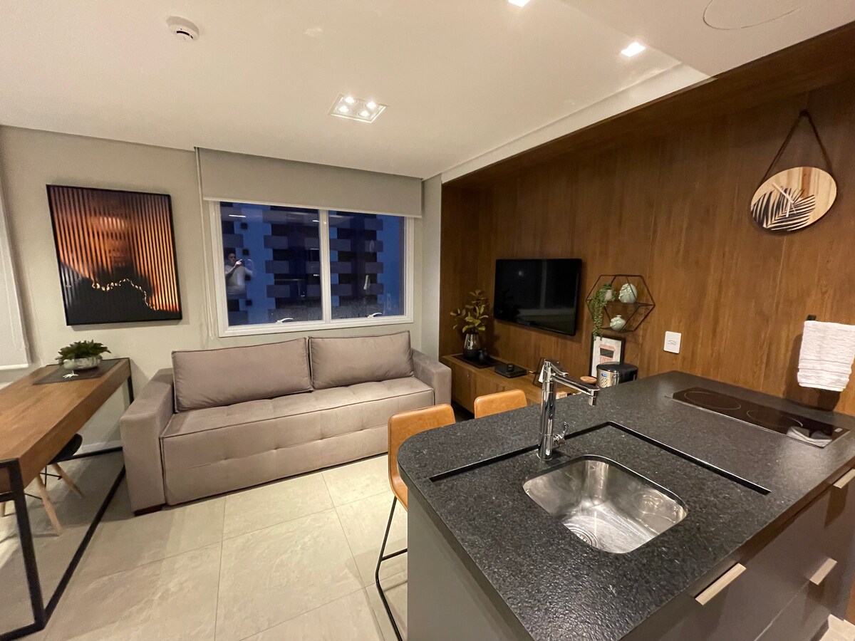 Viva uma experiência única neste estúdio acolhedor e elegante, projetado com atenção aos detalhes para oferecer conforto, funcionalidade e muito estilo. O ap azul planejado é um diferencial exclusivo, com iluminação suave e decoração pensada para relaxar, móvel inteligente e versátil que se transforma em mesa de jantar ou apoio para cozinhar — perfeito para quem valoriza funcionalidade. Piano digital disponível para relaxar, praticar ou se inspirar. Smart TV, Wi-Fi.