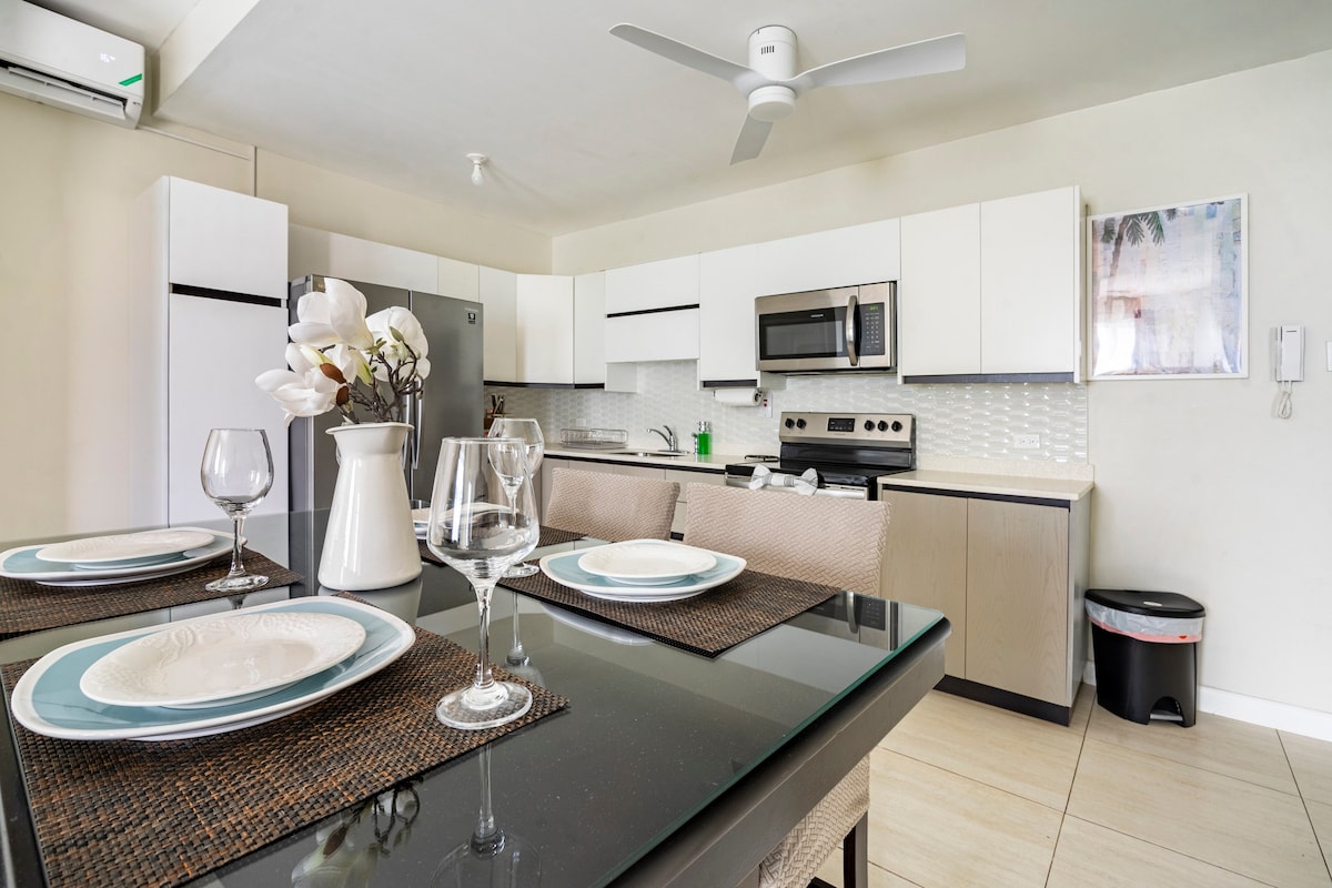 Disfruta de una experiencia relajante en este complejo de apartamentos de estilo resort céntrico, justo enfrente del Estadio Nacional, a 15 minutos del aeropuerto. Muebles y electrodomésticos modernos, cable, Netflix, Amazon Prime, wifi gratuito, aire acondicionado, calentador de agua, complejo cerrado con seguridad las 24 horas, cancha de tenis, pista para correr, casa club, gimnasio, estacionamiento gratuito y césped bien cuidado. Cerca de las principales zonas comerciales, restaurantes elegantes, tiendas de comestibles, el Museo Bob Marley, Devon House y Emancipation Park.