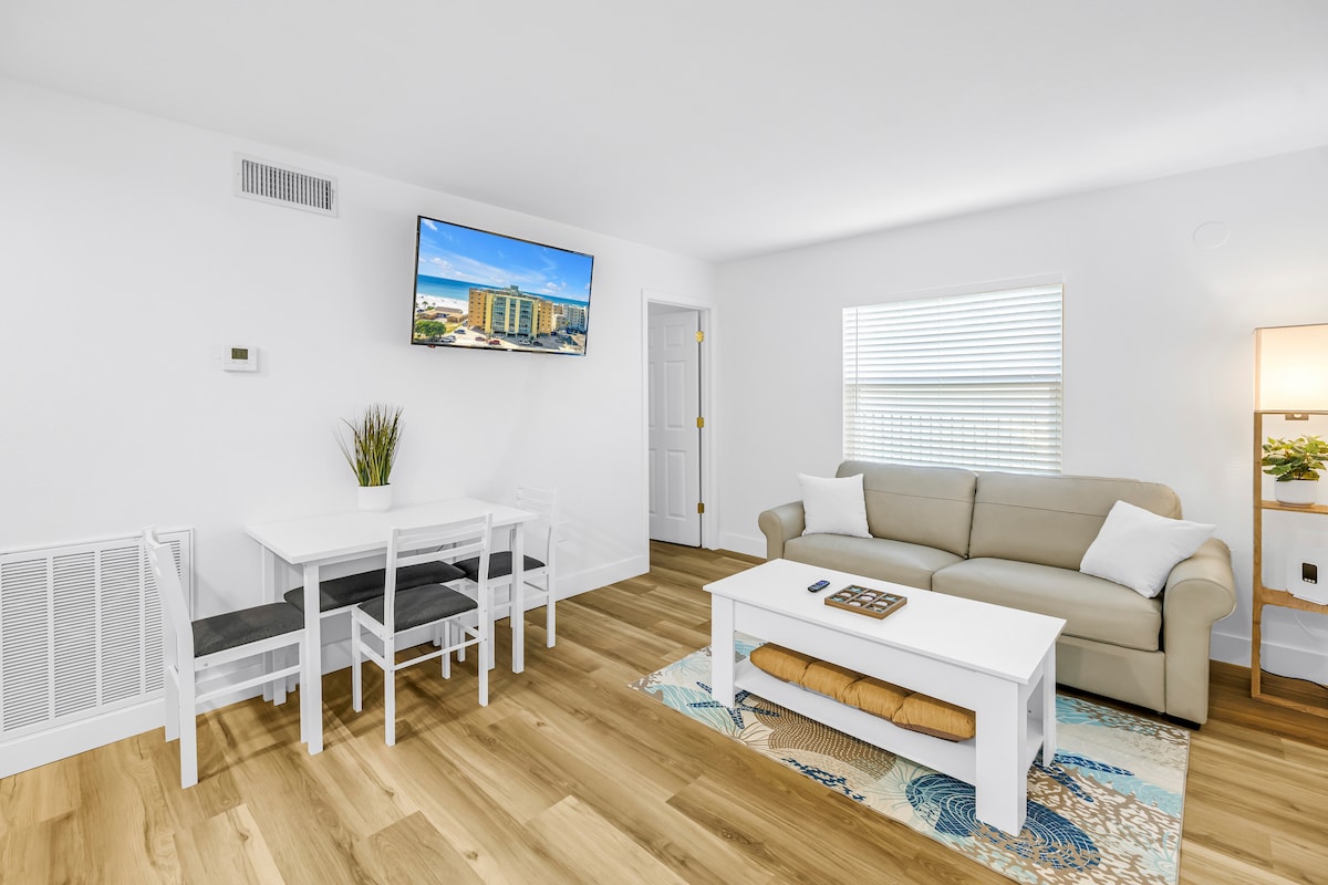 Bienvenido a Blue Sea Renity, tu tranquilo refugio de playa de 1 dormitorio a solo 2 minutos de la arena en Indian Shores, Florida. Con una piscina climatizada, aparcamiento gratuito en el hotel y un complemento completo de equipo de playa (sillas, nevera, sombrilla, carrito), todo lo que necesitas para una estancia relajante en la costa del Golfo está aquí. Diseñado para viajeros solos, parejas, familias pequeñas o escapadas de trabajo remoto, nuestro apartamento combina la comodidad moderna con la verdadera facilidad junto a la playa. ¡Echa un vistazo a las fotos, elige las fechas y que empiecen las vacaciones!