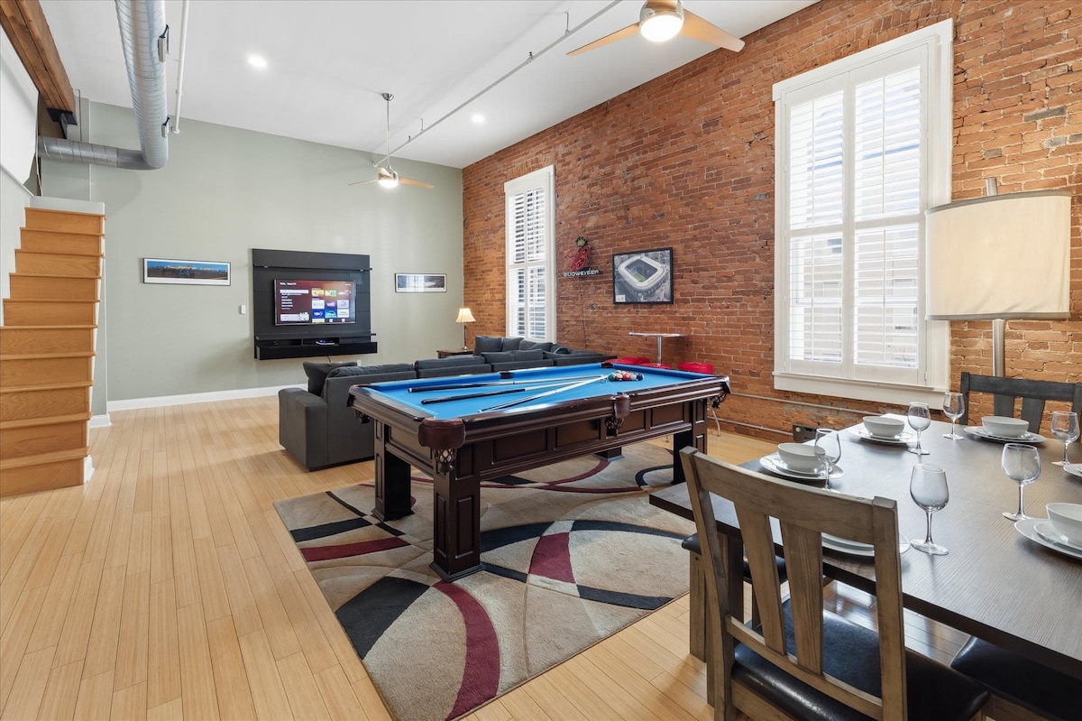 ¡Hermoso loft en ático en el centro de la ciudad! Los techos altos, los ladrillos a la vista y los muebles nuevos hacen de este el lugar perfecto en el centro de Indy. Camina a cualquier lugar: a 2 minutos del Centro de Convenciones, a 1 minuto de Gainbridge Fieldhouse para los Pacers y a 5 minutos de Lucas Oil para los Colts. Ideal para grupos grandes, con mesa de billar y aparcamiento gratuito, incluida la carga de vehículos eléctricos. ¡Disfruta de la mejor ubicación y comodidad en el corazón de la ciudad!