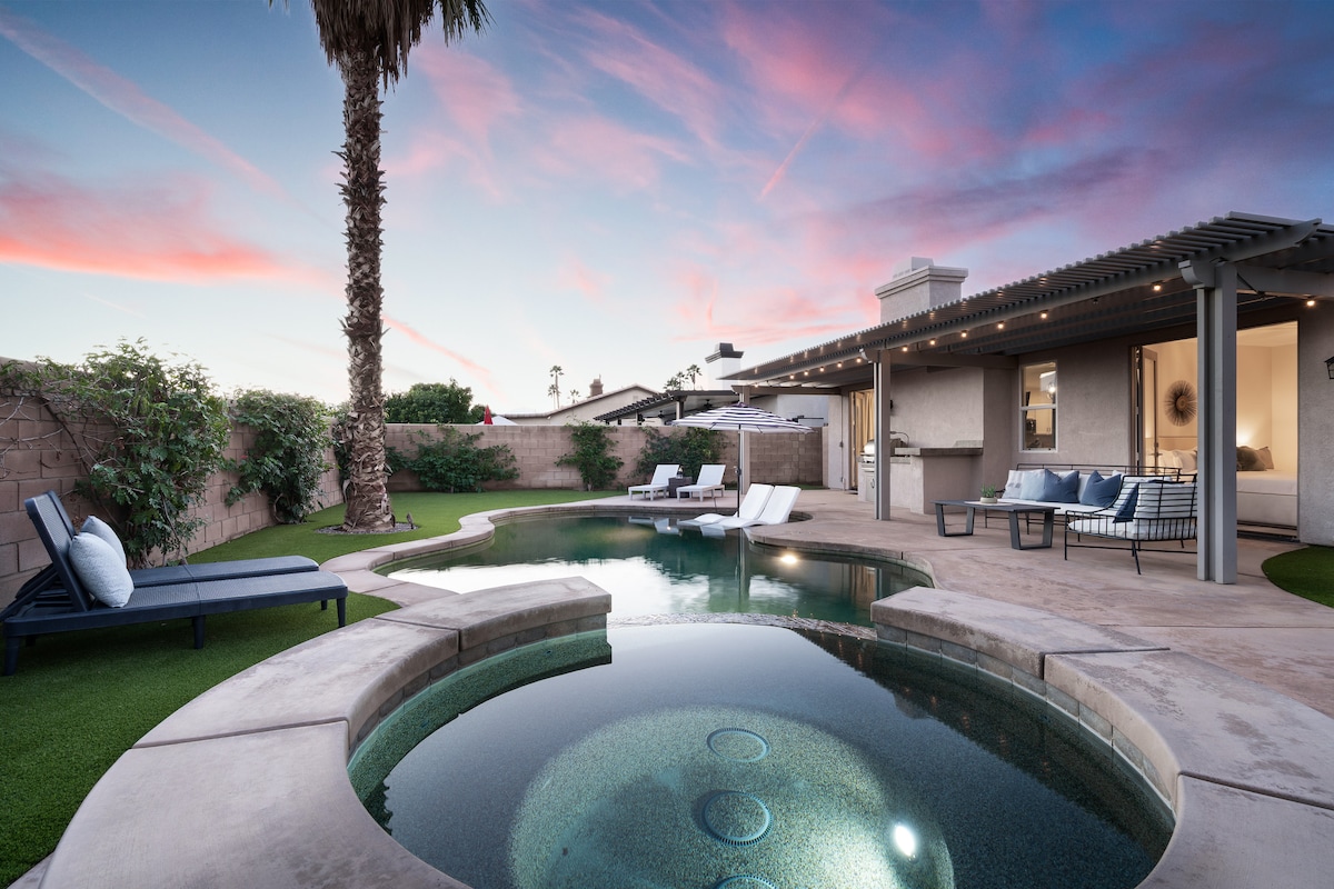 ¡El mejor refugio vacacional! Piscina climatizada y spa + chimenea, cancha de bochas, futbolín, billar, mesa de póquer, ping pong + juegos. ¡Tu oasis en el desierto te espera! ¡Esta casa de más de 2100 pies cuadrados es un centro vacacional en sí misma! Esta cómoda casa de 4 dormitorios y 3 baños con cocina de chef ofrece una planta abierta, una hermosa sala de estar al aire libre con barbacoa, pérgola y exuberantes jardines con vistas a la piscina y al spa. Patio trasero. La piscina y el spa son privados con pared de privacidad. ¡Está elegantemente y creativamente amueblada y equipada para que tu estancia sea extraordinaria!