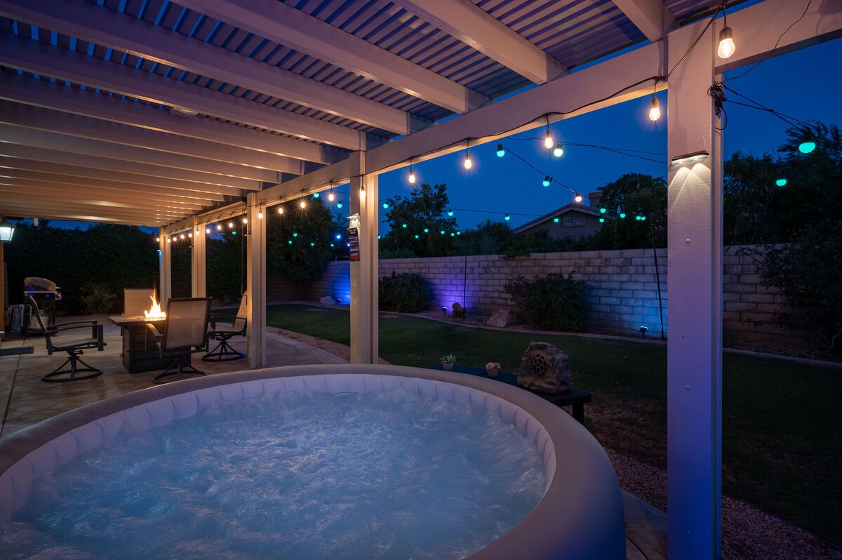 ☀️ Disfruta de días soleados en el paraíso de los golfistas cerca de Palm Springs en Indian Palms Country Club & Resort en Indio, California, ¡a solo 25 minutos de Joshua Tree! 🚶A poca distancia del Festival de Coachella 🔐 Seguridad cerrada 24/7. 💦 Jacuzzi privado GRATIS, 🎶 altavoz al aire libre, 🏊 piscina climatizada, 🎾 pickleball y gimnasio (hasta 4, previa solicitud). 🔥 Patio trasero privado con fogata, parrilla, futbolín, sala de juegos de los 80, cartas y juegos de mesa. 🚲 Alquiler de bicicletas en el lugar.
