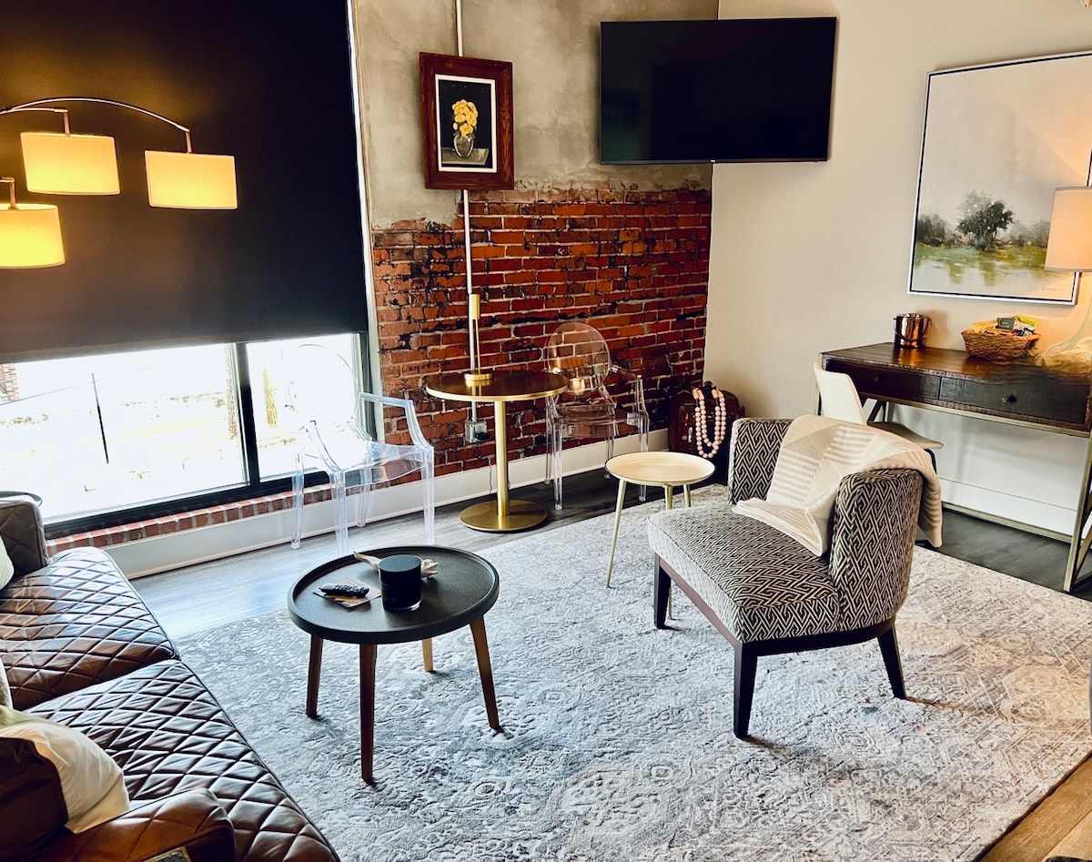 La suite crème de le crème en el hermoso hotel boutique, The Hive. No se escatimaron detalles en esta lujosa suite con paredes de ladrillo visto originales, techos altos de 12 pies, una cocina moderna con hermosas encimeras de cuarzo y electrodomésticos de acero inoxidable y una mesa de comedor para 4-6. ¡La acogedora sala de estar tiene grandes ventanales, un sofá cama de cuero con colchón de espuma viscoelástica y arte original en todas partes! Desde la gran ducha a ras de suelo hasta las sábanas y toallas de lujo, y