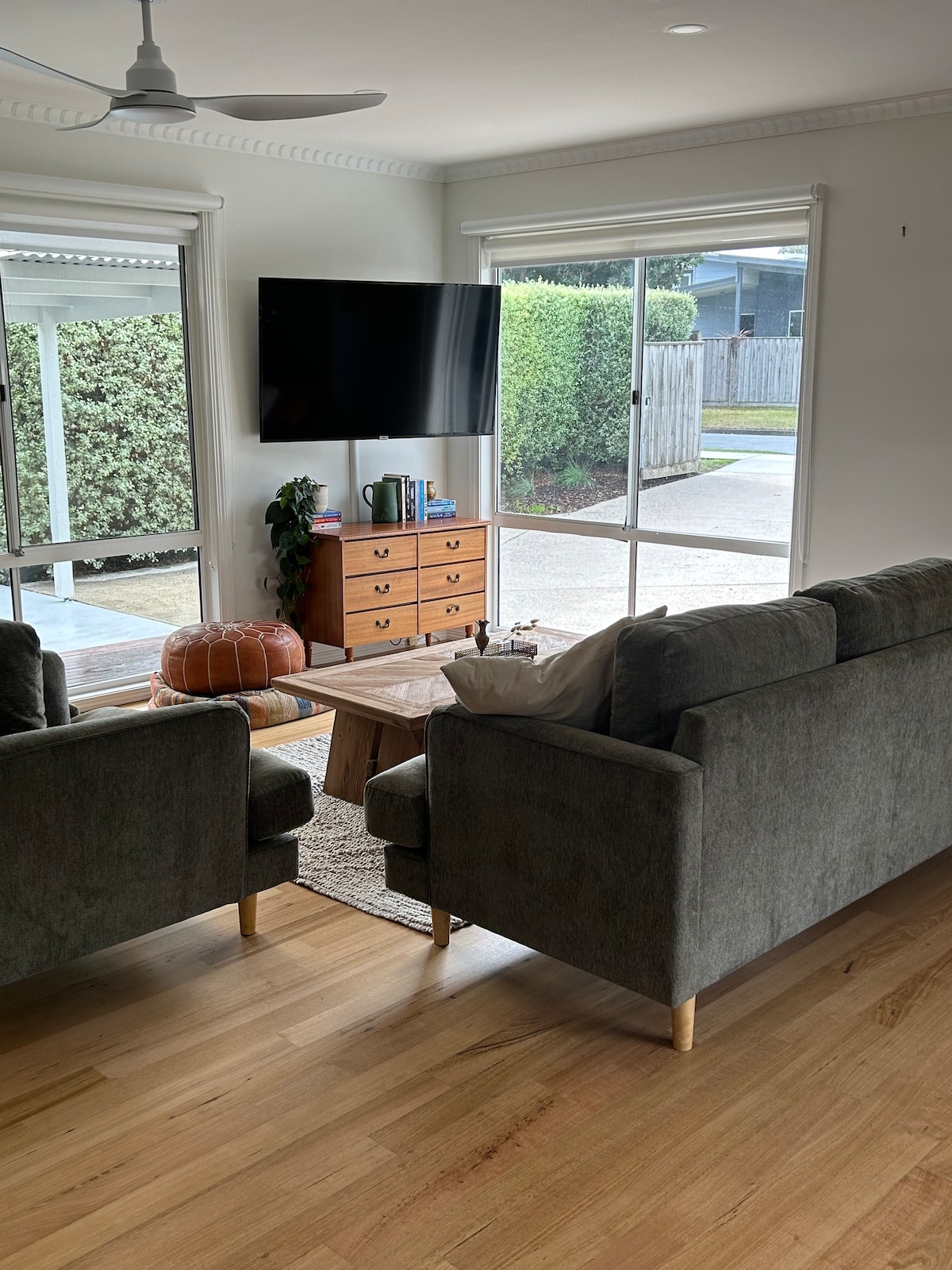 Architect designed energy efficient house, with the private apartment attached, a view from every window. There is a separate bedroom, separate sitting room, separate bathroom, small kitchen, washing machine, Aldi coffee machine, and microwave, air fryer, oven combination, and a 2 plate stove Separate entry. Private unfenced garden that is also part of of a native tree reserve with access to footpath, and walking paths to beach, 1km and a delightful bush track 2 km to cafe No Children. No dogs
