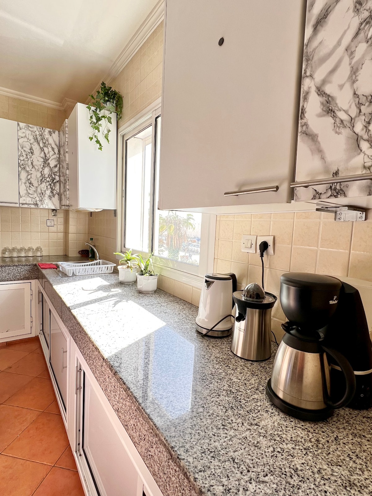 Disfrute de un alojamiento elegante, céntrico, amplio, soleado y bien equipado. Se encuentra a 1 minuto del zoco a pie y a 19 minutos de la playa a pie y a 5 minutos en coche. Se encuentra en una residencia segura LAS 24 HORAS, puede disfrutar de las compras en el zoco, restaurantes, cafeterías… Este alojamiento es muy luminoso, tranquilo y limpio, con dos terrazas cubiertas y no cubiertas. El apartamento decorado con gusto y amor.