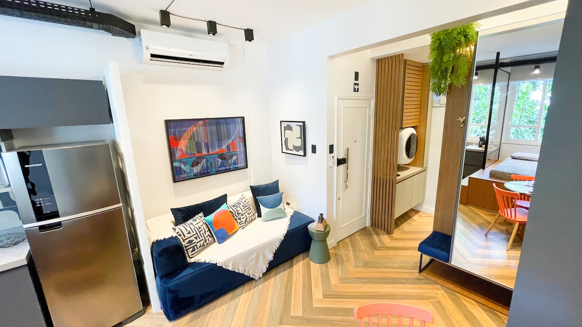 Precioso estudio, decorado y reformado. ¡Ipanema! Muy cerca de la playa. (A 1 cuadra y media/ 180 metros). Situado en la famosa calle Vinícius de Moraes, un lugar con mucha historia brasileña. Propiedad iluminada, aireada y funcional. Vista verde, frente con ventanales. Cama doble, sofá cama, cocina planificada/ equipada, mesa, sillas, internet de alta velocidad, smartv, aire acondicionado, black out, armarios y amplio baño. Edificio clásico con 2 tramos de escaleras o 32 escalones. ¡Bienvenidos!