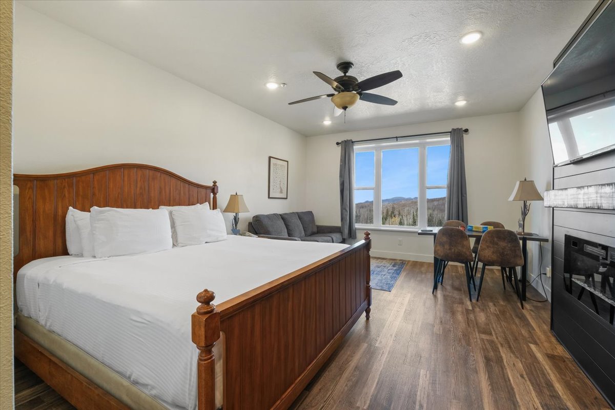 Charming studio at Cedar Breaks Lodge with king bed plus queen sleeper sofa, sleeping up to 4 guests. Cozy up by the fire after a day at the slopes. Or unwind in the sauna after exploring all that Southern Utah has to offer. Amenities: - Pool & hot tubs - Sauna - Library & game room - On-site laundry - Walking distance to Navajo Lift - Shuttle pickup in parking lot - Covered Garage BL-24035