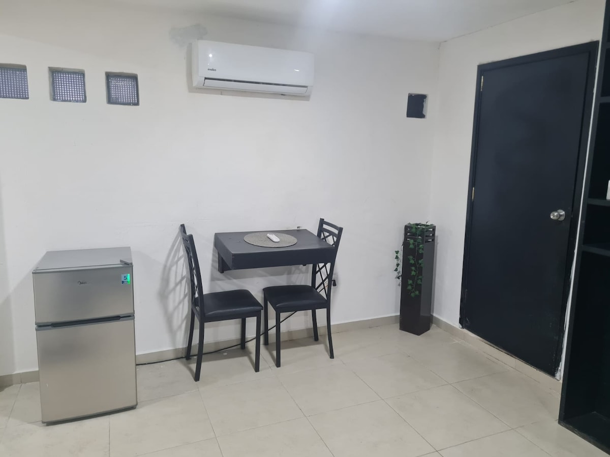 Maravilloso estudio para una o dos personas(no niños) en una zona céntrica y tranquila de Cancun. Cómodo, luminoso y muy bonito(nuevo). Tiene todo lo esencial para tu estancia en Cancun: TV con cable y Netflix, Aire Acondicionado, Wifi, Cocineta con refrigerador, alberca, top roof y mas amenidades. A pocos minutos caminando hay plaza comercial, restaurante, tiendas y transporte publico a dos calles para la ir a la zona hotelera y playas publicas. Todo lo necesario para sentirse como en casa.