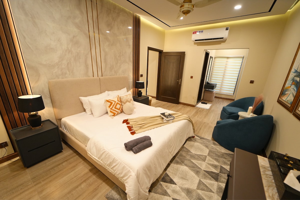 Bienvenido a nuestras elegantes suites de dos dormitorios en DHA 5 Islamabad. Disfruta de la comodidad de un viaje rápido y relájate en un espacio con una decoración encantadora y un cine en casa totalmente equipado. Ideal para viajeros que buscan comodidad y entretenimiento, este acogedor refugio ofrece comodidades modernas en una ubicación privilegiada. Es una porción completamente separada con su propia entrada y aparcamiento separados, apta para familias, por lo tanto, muy segura y tranquila. No se permiten fiestas ni música alta. No se admiten parejas solteras