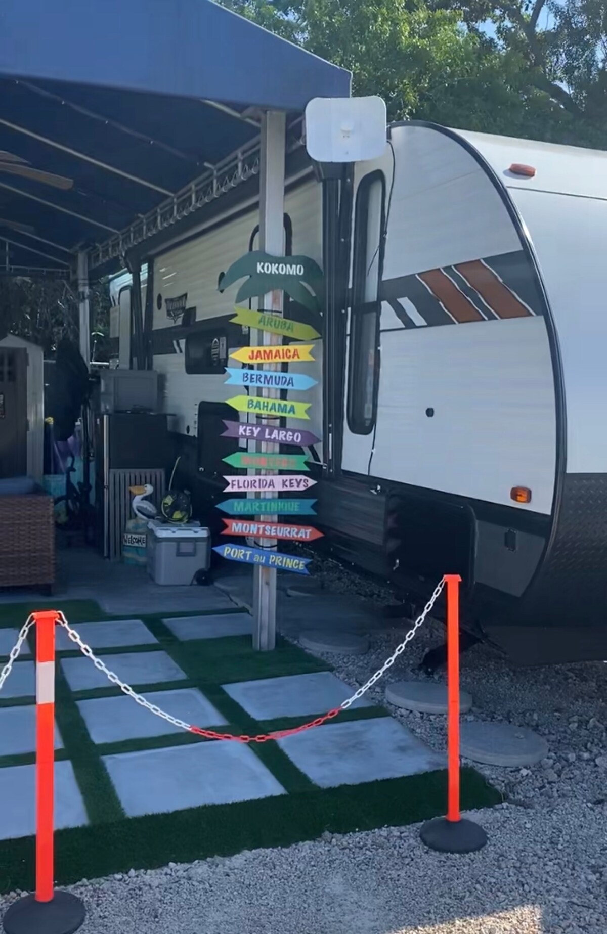 Disfruta de tus vacaciones en este nuevo vehículo recreativo con un gran gusto en el diseño interior. Esta unidad tiene un porche amplio con aire acondicionado, cocina completa y sala de estar. Esta increíble unidad tiene capacidad para un total de 6 huéspedes con 2 dormitorios con colchón de espuma viscoelástica tamaño queen en cada dormitorio y un sofá cama si es necesario. El lote 170 es uno de los lotes más grandes de Key Largo Kampground y se encuentra muy cerca de la piscina con naturaleza en esta escapada inolvidable.